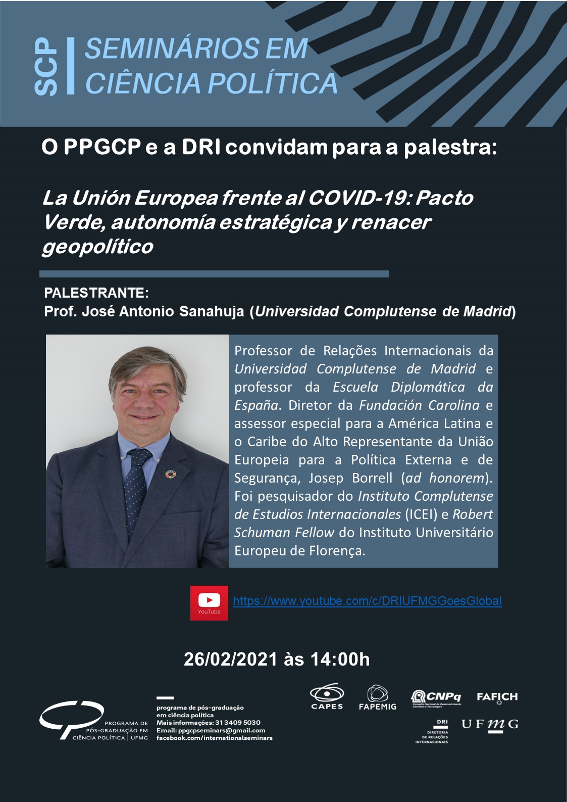 26/02/2021 - Seminários em Ciência Política - "La Unión Europea frente al COVID-19: Pacto Verde, autonomía estratégica y renacer geopolítico"