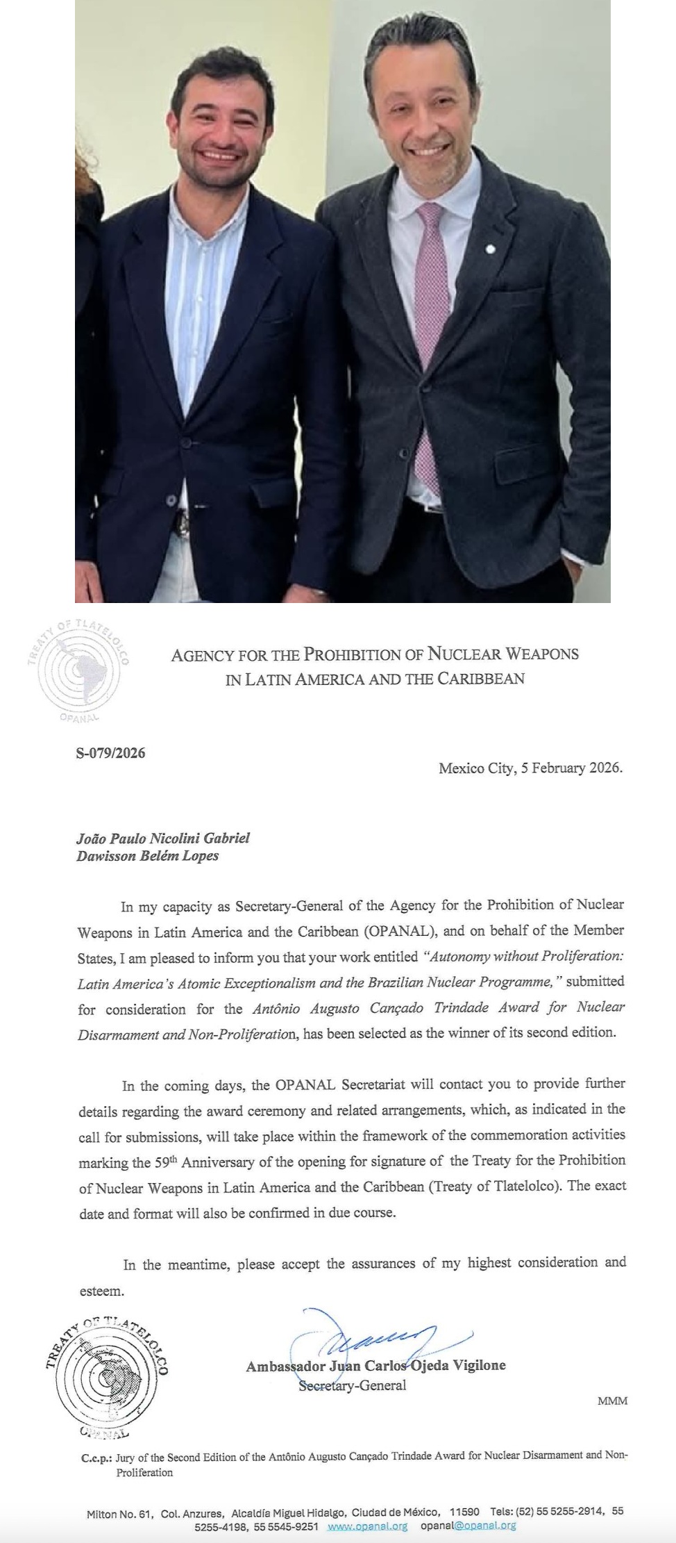 A agenda de pesquisa desenvolvida por João Paulo Nicolini Gabriel e Dawisson Belém Lopes sobre o programa nuclear brasileiro e suas bases diplomáticas recebeu um importante reconhecimento internacional. O estudo intitulado Autonomy without Proliferation: Latin America's Atomic Exceptionalism and the Brazilian Nuclear Programme foi agraciado com o Prêmio Antônio Augusto Cançado Trindade para o Desarmamento Nuclear e a Não Proliferação, concedido pela Agência para a Proibição de Armas Nucleares na América Latina e no Caribe (OPANAL), em sua segunda edição.